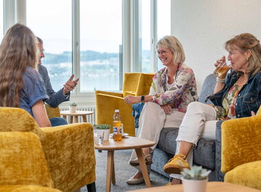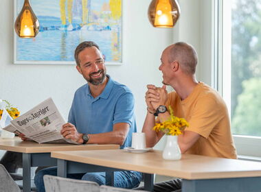 Sie möchten zwischendurch einen Kaffee oder einen Snack geniessen? In unserer einladenden Lounge ist das jederzeit möglich. In den bequemen Sesseln und Sofas erfreuen Sie sich am Ausblick oder am lockeren Austausch mit anderen Gästen bei Gesprächen, Spielen und mehr.